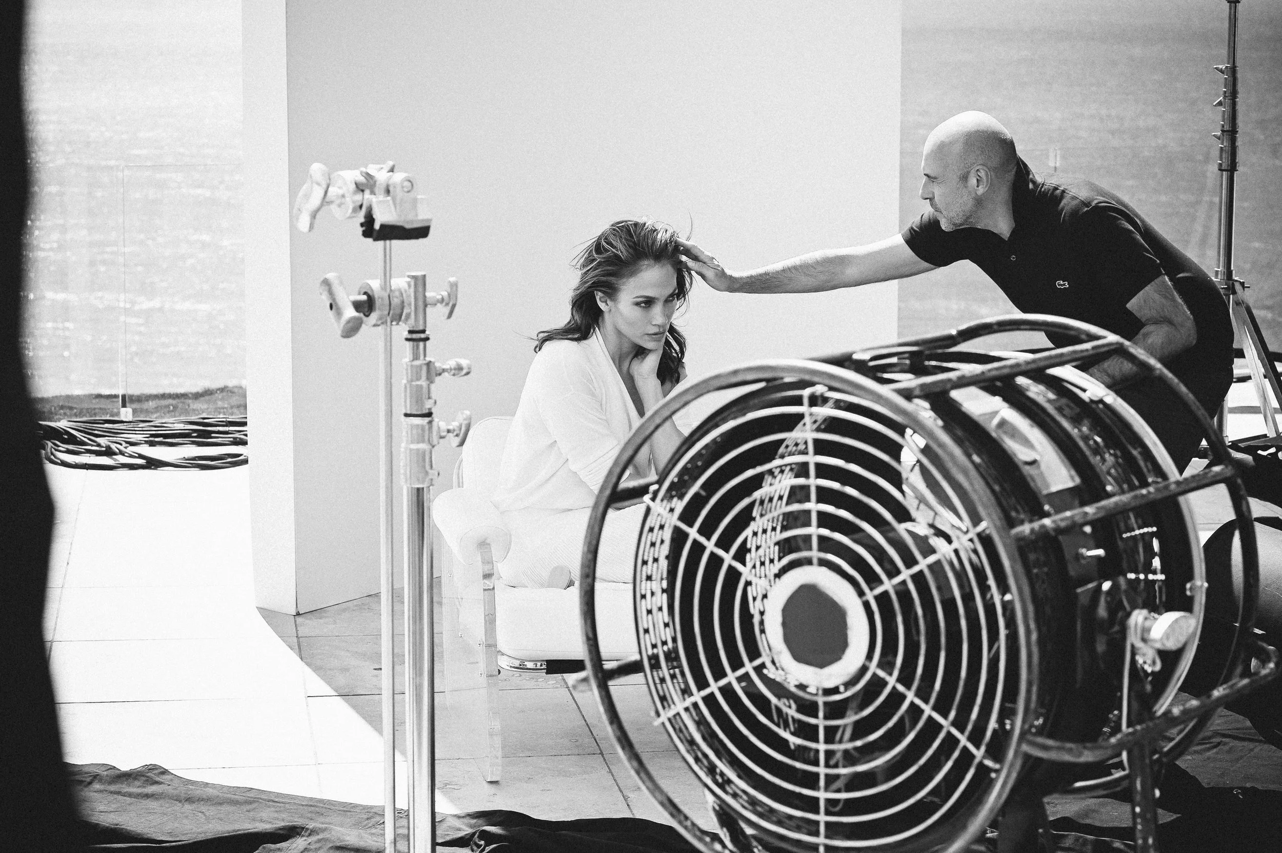 Behind the scenes image by Jory Clay Sutton | Jennifer Lopez for L’Oreal Paris, with hair stylist Stephane Lancien, for “Bright Reveal” directed by Peter Lindbergh.
